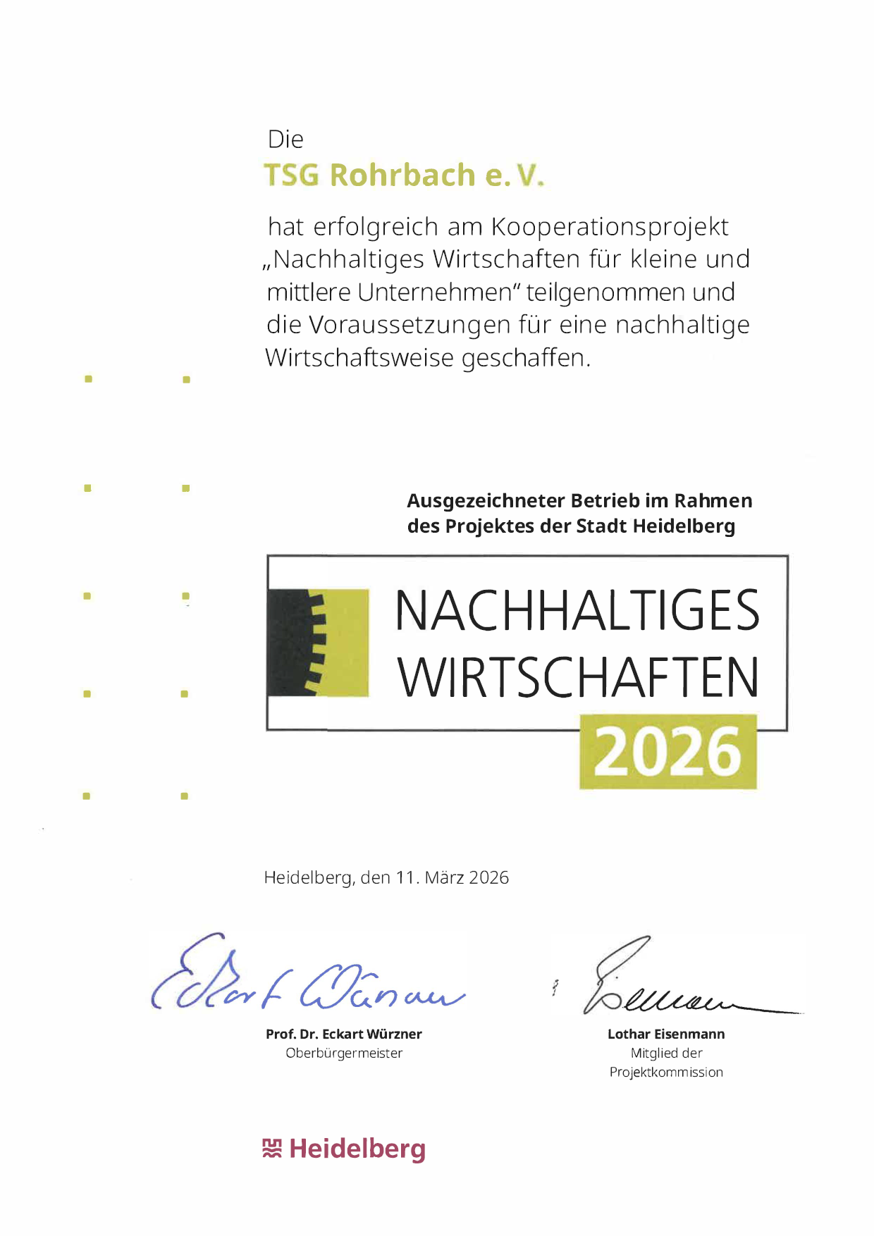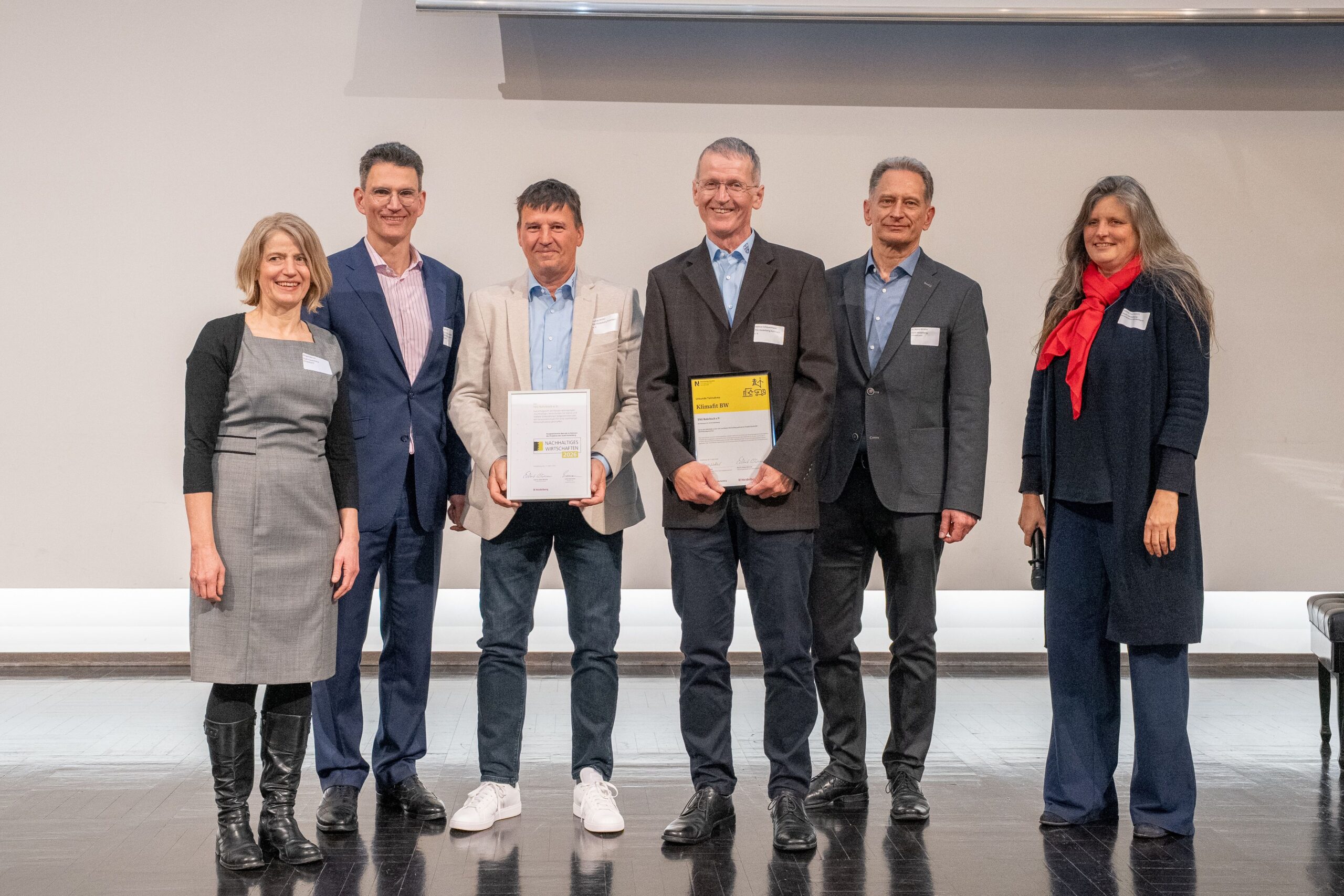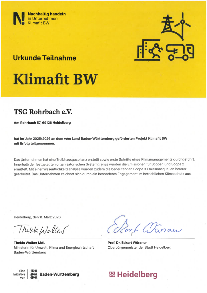 Die TSG Rohrbach wurde im Rahmen des städtischen Projekts „Nachhaltiges Wirtschaften Heidelberg“ erneut für ihr langjähriges Engagement im Umwelt- und Klimaschutz ausgezeichnet. Bereits 2012 schloss die TSG Rohrbach die Erstzertifizierung erfolgreich ab und hat seither die nachhaltige Weiterentwicklung der Vereinsstrukturen konsequent vorangetrieben. Mit der erfolgreichen Re-Evaluierung bestätigt der Verein seine kontinuierliche und verantwortungsbewusste Arbeit im Bereich Nachhaltigkeit. Bei der Prämierungsveranstaltung am 11. März in der Aula der Neuen Universität nahmen Thomas Müller und Helmut Scheuermann die Zertifikate „Nachhaltiges Wirtschaften 2026“ und „Klimafit“ entgegen.