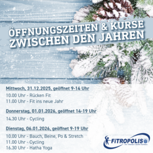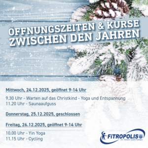 Alle Jahre wieder … gibt es über die Weihnachtsferien unseren traditionellen Weihnachtskursplan mit geänderten Öffnungszeiten über die Feiertage.