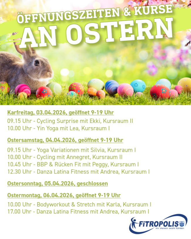 Beachten Sie unsere Öffnungszeiten und das speziell für die Feiertage zusammengestellte Kursangebot im FiTROPOLIS über die Osterfeiertage – genießen Sie die Feiertage und bleiben Sie
